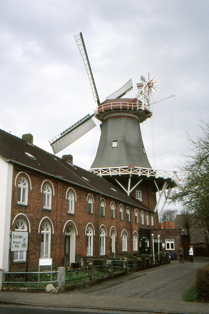 Entstanden ist das Modell aus Auhagen-Baukastensystemteilen (Mauerwerk, Türen, Tore und Fenster sowohl des Müllerhauses als auch des unteren Achtkantes der Mühle), einer Fallermühle (mit selbstgefertigten Teilen des hölzernen Achtkantes aus Pappe und Schleifpapier als Teerpappenimitation) und vielen Mauerwerksplatten für die Mühle und Dachplatten für das Müllerhausdach. Dieses habe ich als in der Literatur als "blaue Dächer" bezeichnetes Dach, dass einst auf vielen landwirtschaftlichen Bauten Ostfrieslands gedeckt war, nachgebildet. "Blaue Dächer" spiegelten auf die Ferne das Himmelsblau und müssen aus dunkel lasiert gebrannten Ziegeln bestanden haben. Früher häufig, heute selten, entdeckte ich jüngst beim Glockenturm der Kirche in Greetsiel solche dunkelglänzend lasierte Dachziegel.